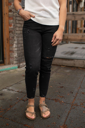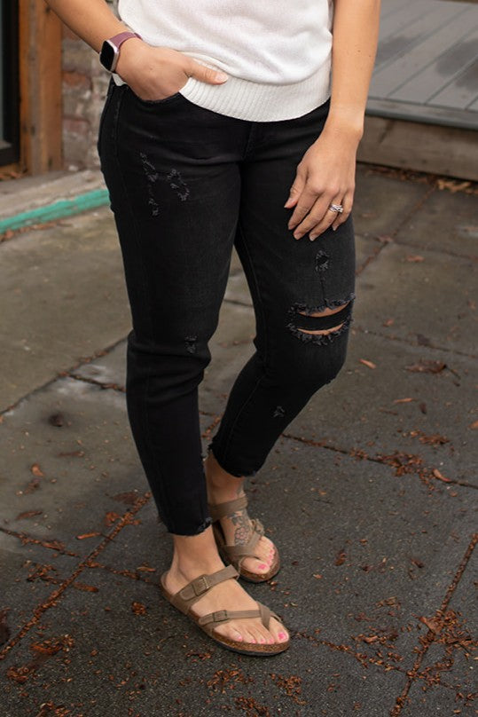 Black Destroyed Jeans.  5-pocket design. Zip Fly.