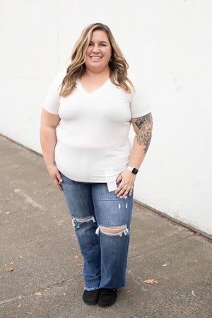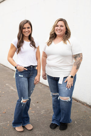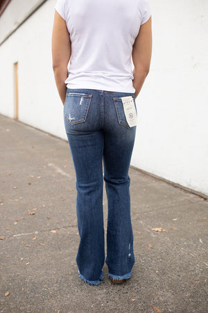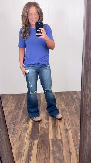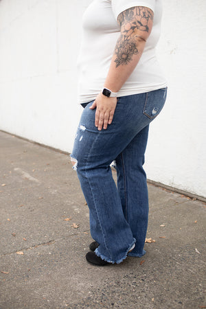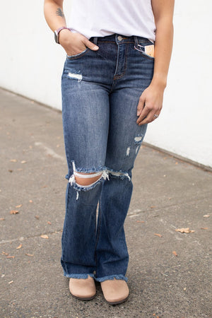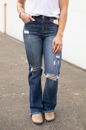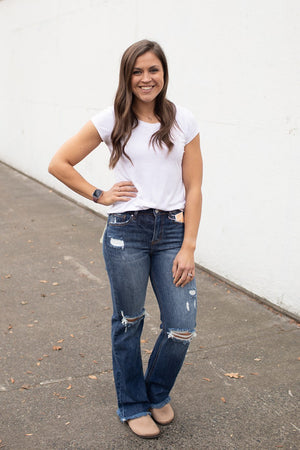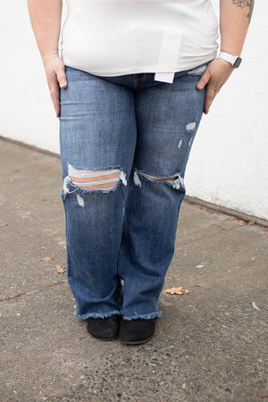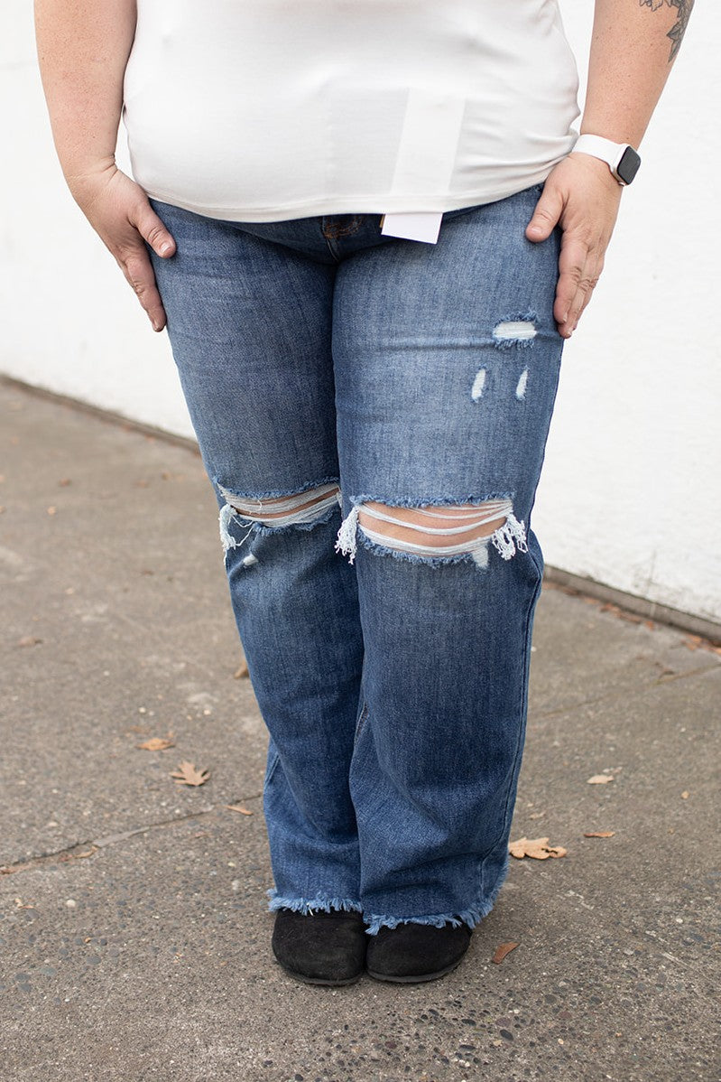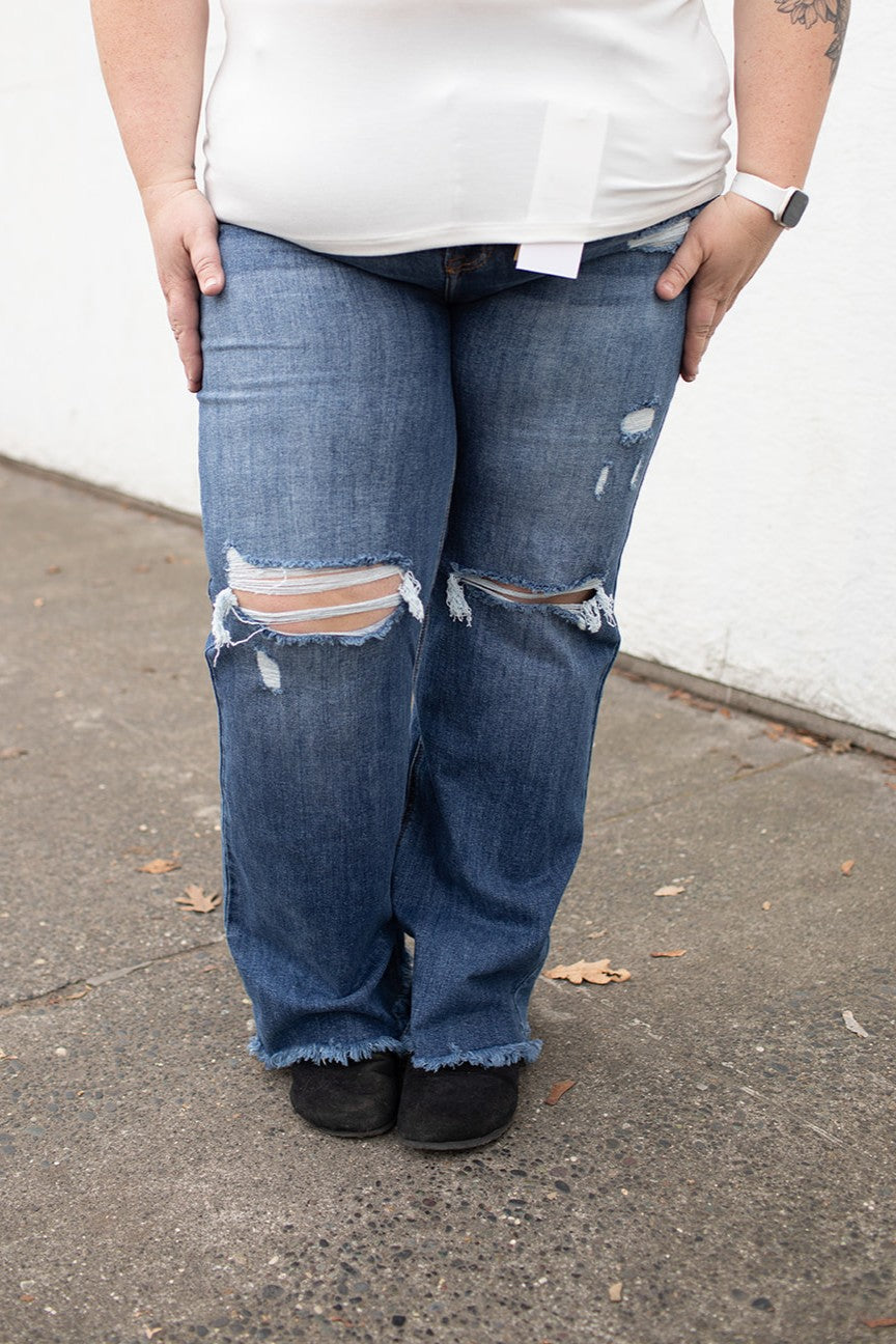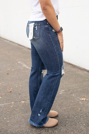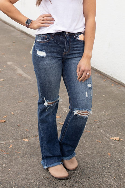 Love a high rise destroyed straight leg?!?! Meet your new faves! Deep blue wash, destroyed details, Raw hem. 5-pocket design. Zip Fly.