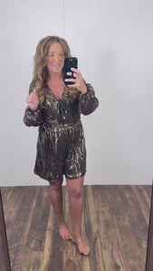 GLAM IT UP!!  Got an event? Headed to Vegas or Nashville? Or just feeling a little fancy? ... step up your vibe in our Sequin Romper!  Black lightweight stretchy mesh fabric that's covered in rose gold sequins.  Everything but the arms is lined with soft & stretchy silky fabric. Cross over chest with a snap closure. Vneck. Tie belt waist. The sleeves are sheer with a balloon fit and elastic at the cuff.  4" Inseam(small)