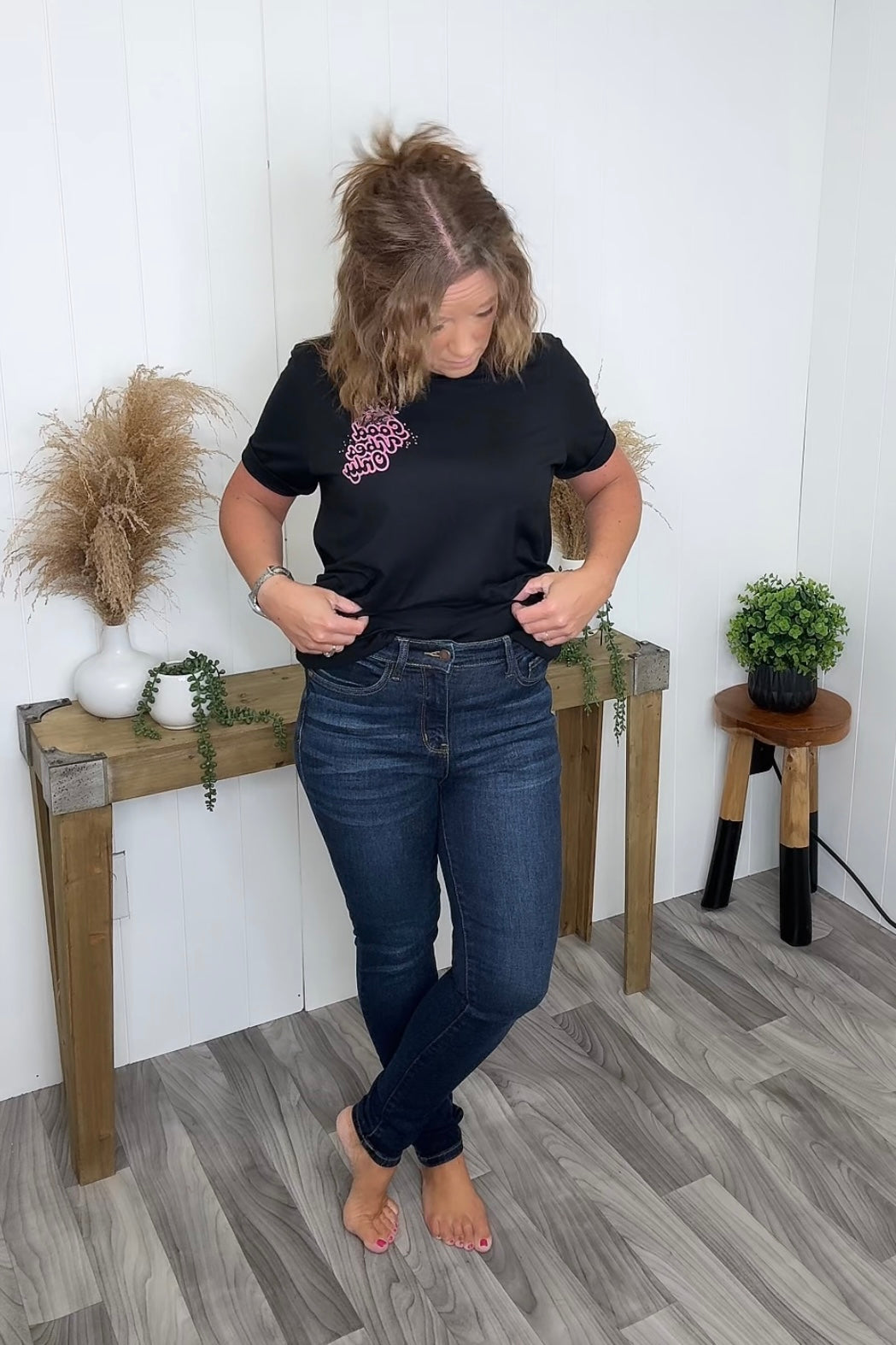 The ultimate every day jeans! High Rise, Whiskering, but no holes. 5-pocket design. Zip Fly.