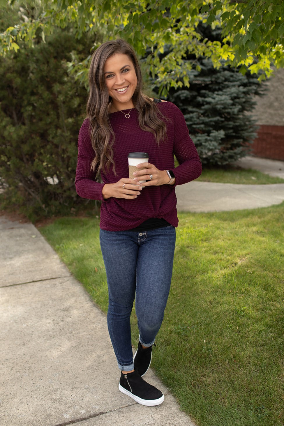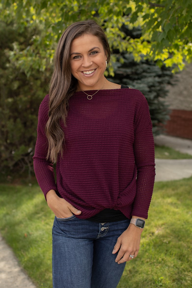 Dk Mauve Waffle Notched Neck LS (SM-XL)
