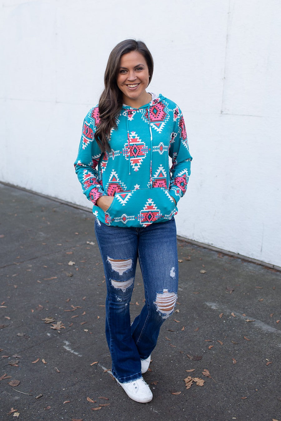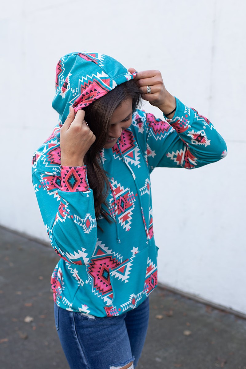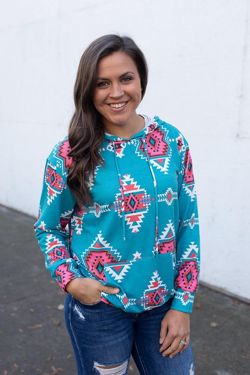 Lightweight. Super soft. And totally adorable! The Turquoise Sadie Aztec Hoodie is that perfect throw-on-and-go piece with a bold print that turns heads. Featuring a relaxed fit, a kangaroo pocket, and the dreamiest fabric—you'll never want to take this one off! 😍 All over Aztec design. Banded bottom. Kangaroo pocket.