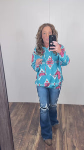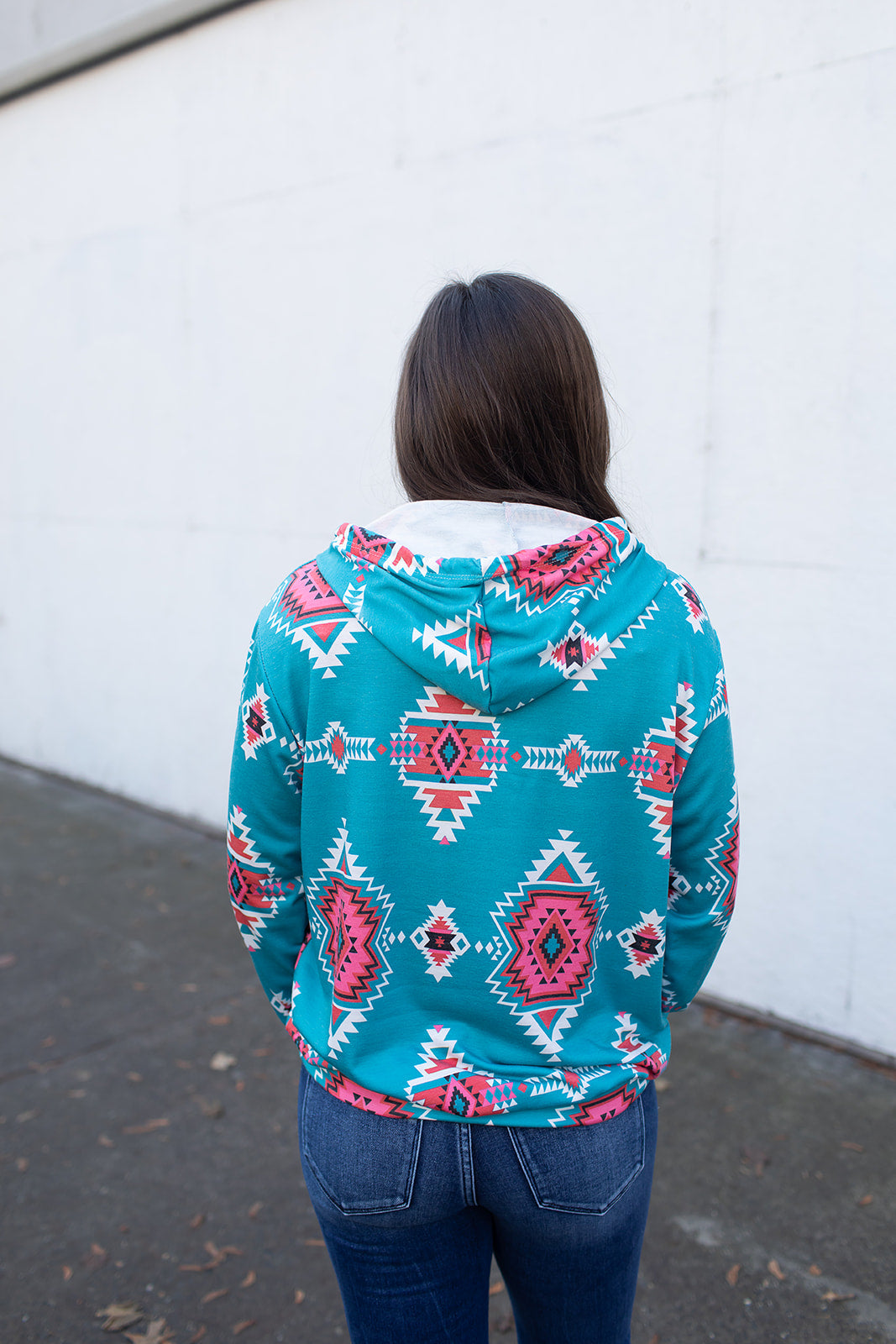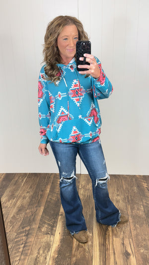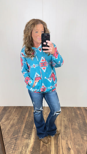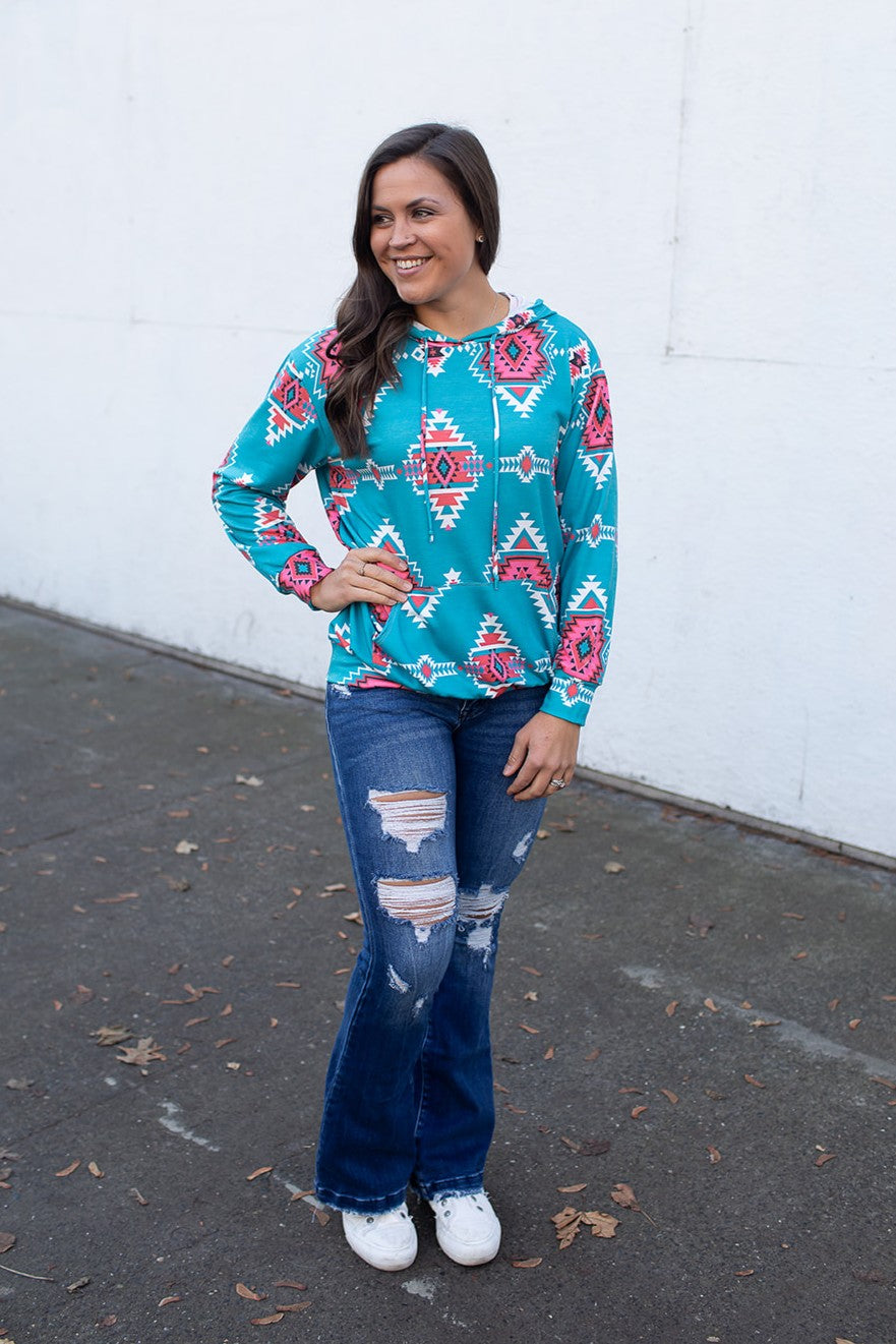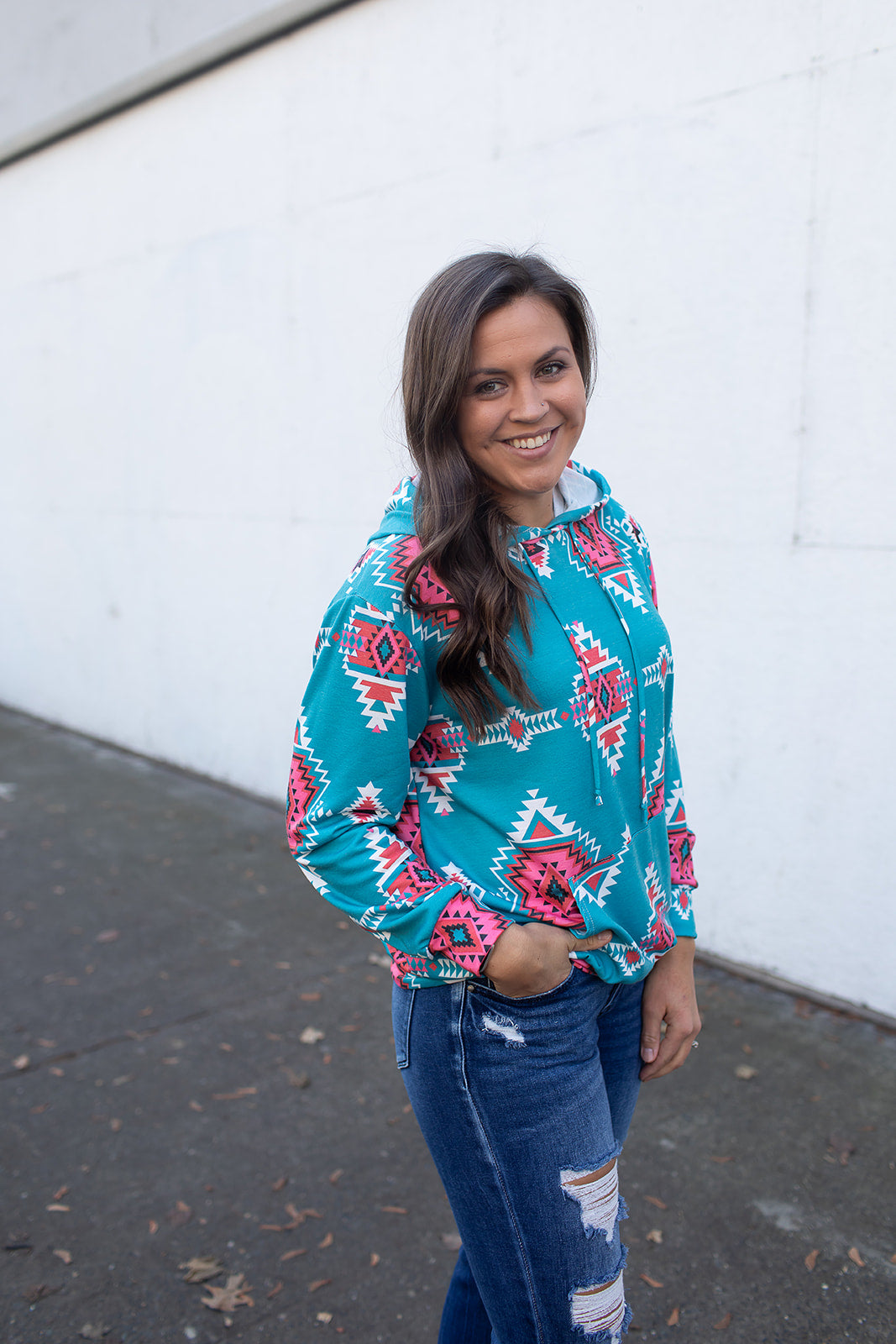 Lightweight. Super soft. And totally adorable! The Turquoise Sadie Aztec Hoodie is that perfect throw-on-and-go piece with a bold print that turns heads. Featuring a relaxed fit, a kangaroo pocket, and the dreamiest fabric—you'll never want to take this one off! 😍 All over Aztec design. Banded bottom. Kangaroo pocket.