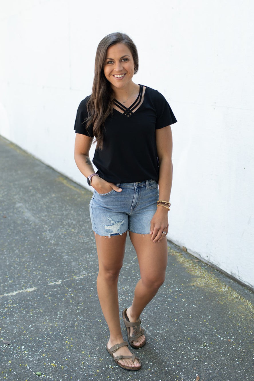 Black Basic Cotton Vneck Long Sleeve Tee (SM-3X)
