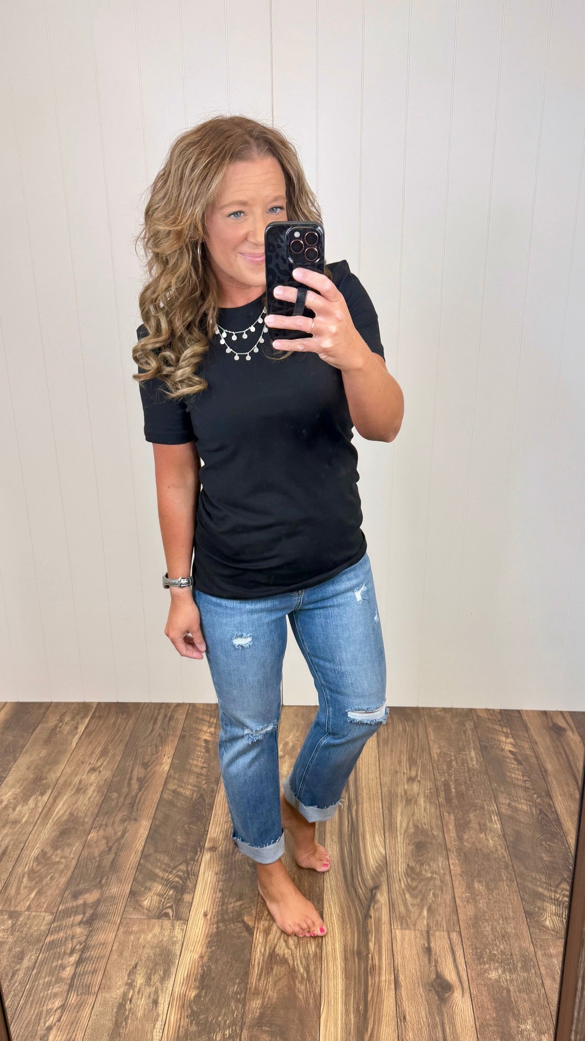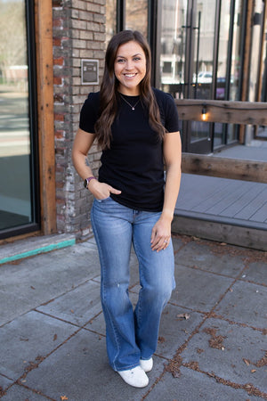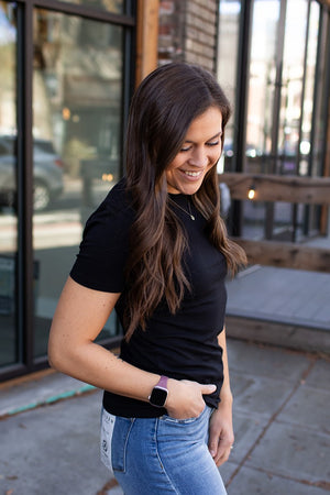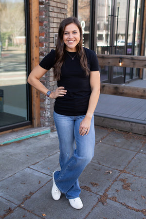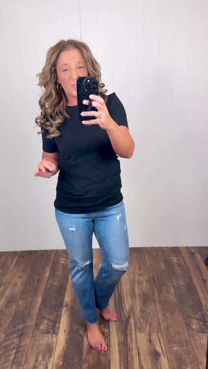 Soft. Stretchy. Crew Neck. Straight Bottom Hem. These are FITTED.