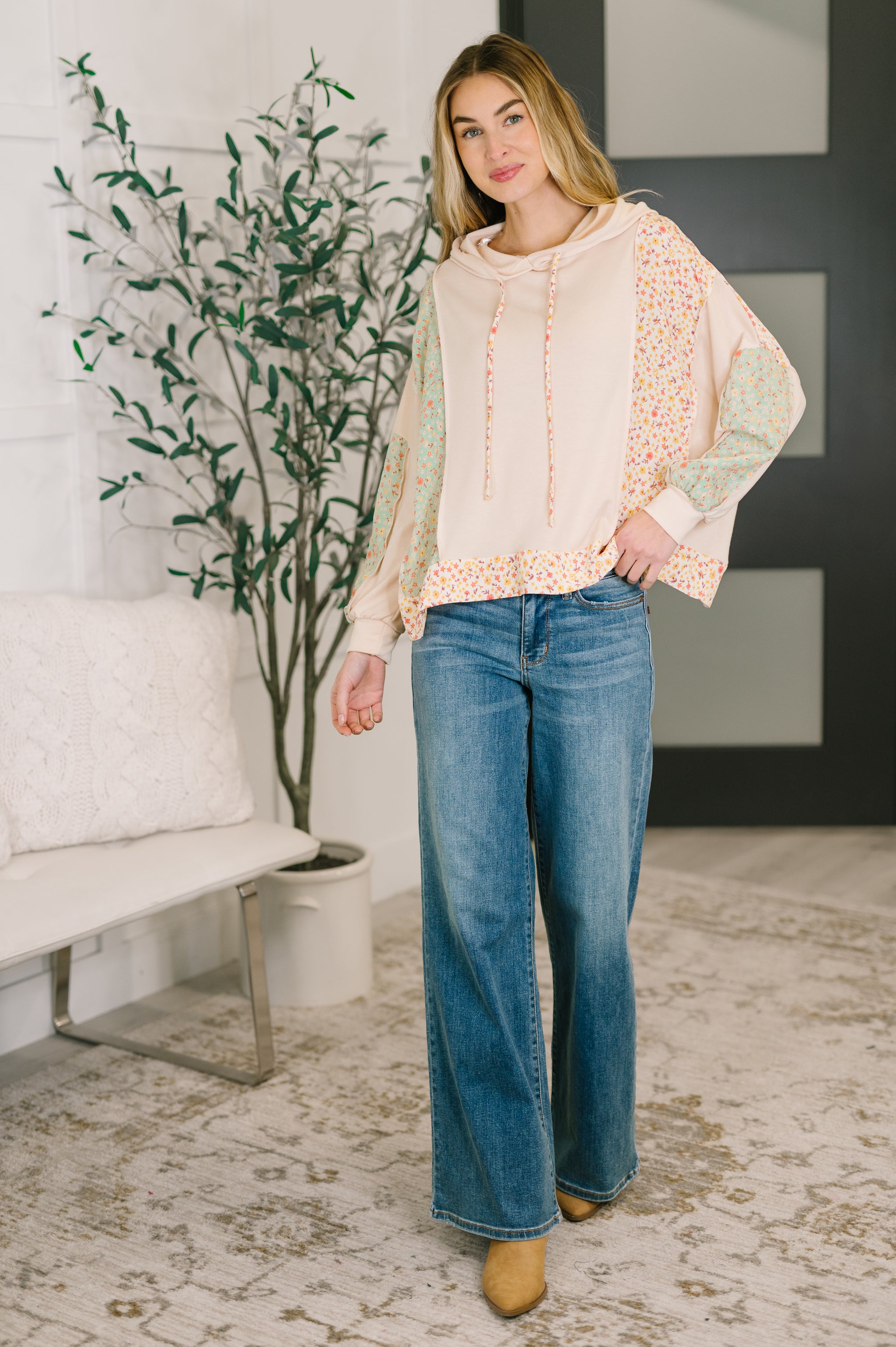 Wrap yourself in cozy cool with this Floral Patchwork Hooded Pullover that's equal parts comfort and edge. The soft French terry base pairs beautifully with crinkle woven contrast details, while drop shoulders give you that relaxed, effortless vibe. High-stretch fabric moves with you, and a functional drawstring hood lets you customize your fit. Banded sleeve cuffs and hem keep things neat, while exposed seam details add an artsy touch that makes this pullover anything but ordinary.
