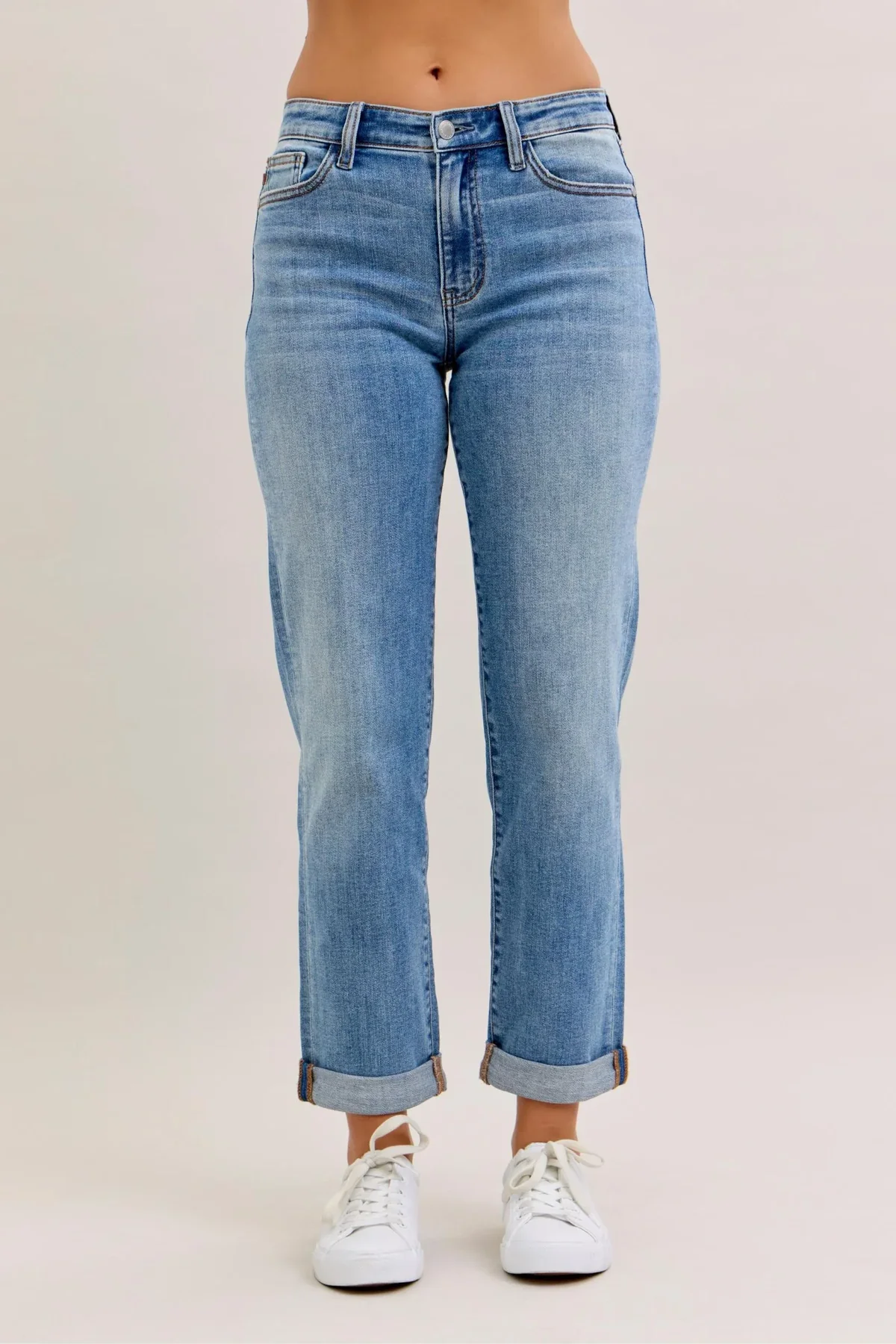 Meet your new go-to pair! The Aubrey Mid Rise Boyfriend jeans from Judy Blue deliver effortless style with serious comfort. Featuring a relaxed boyfriend silhouette that's perfect for everything from coffee runs to weekend hangs, these jeans hug you in all the right places with a flattering mid-rise fit. The 4-way stretch fabric moves with you, while the rolled cuff adds a fun, casual vibe. Finished with a classic zipper fly for easy on-and-off. Versatile, comfy, and undeniably cool—your new favorite jeans are here.