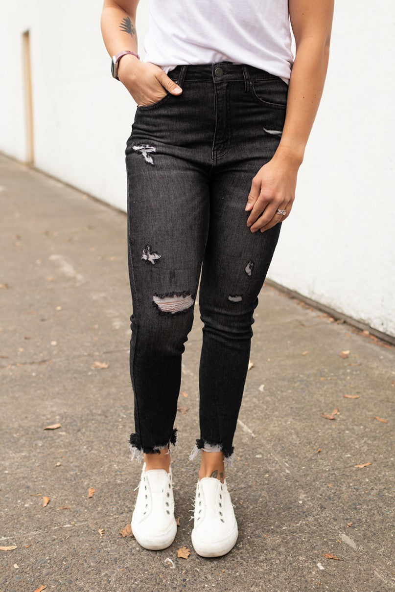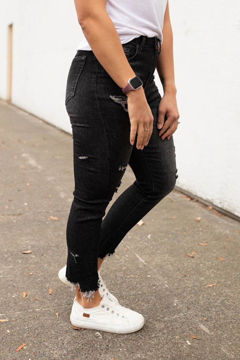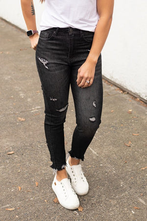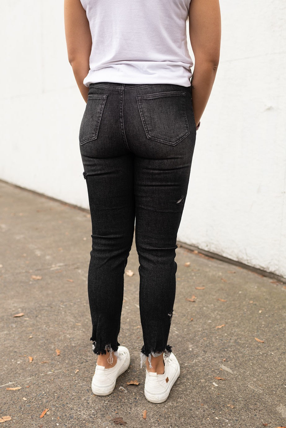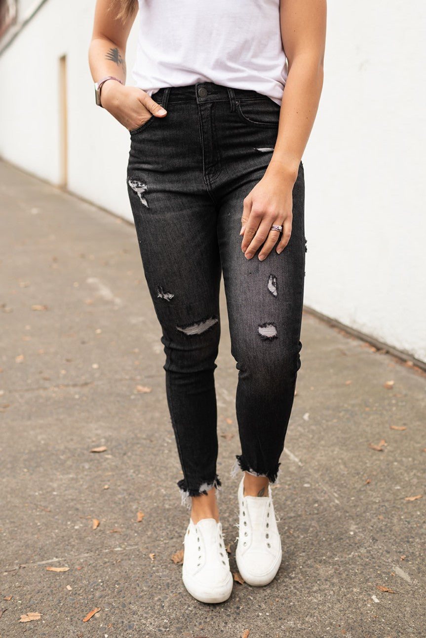 Faded Black Destroyed Jeans. 5-pocket design. Zip Fly. Relaxed Skinny Leg.